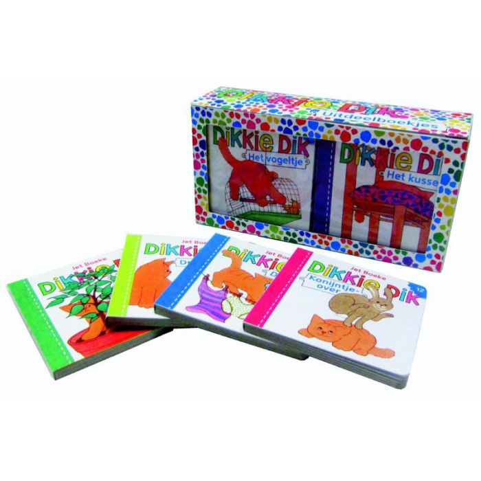 Deze box bevat 16 kleine kartonboekjes, elk met twee verhaaltjes over de geliefde oranje kater van Jet Boeke. De boekjes volgen Dikkie Dik tijdens allerlei kleine avonturen, zoals een verhaal over een inktpot, een eekhoorn, een verjaardagskaart en een paar tweelingpoezen. De verhalen zijn ideaal voor kinderen vanaf 18 maanden.