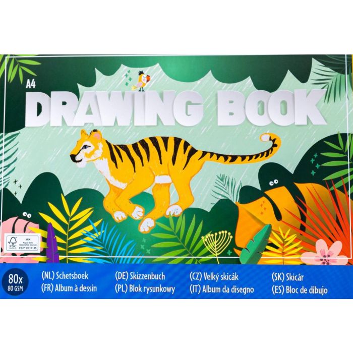 Schetsboek in A4 formaat met een opdruk van jungle dieren op de voorzijde. Aan de binnenzijde vind je 80 blanco vellen van 80 grams papier om je mooiste schetsen en tekeningen te maken.