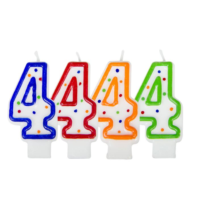 Verjaardagskaars cijfer 4 - wit met gekleurde stippen